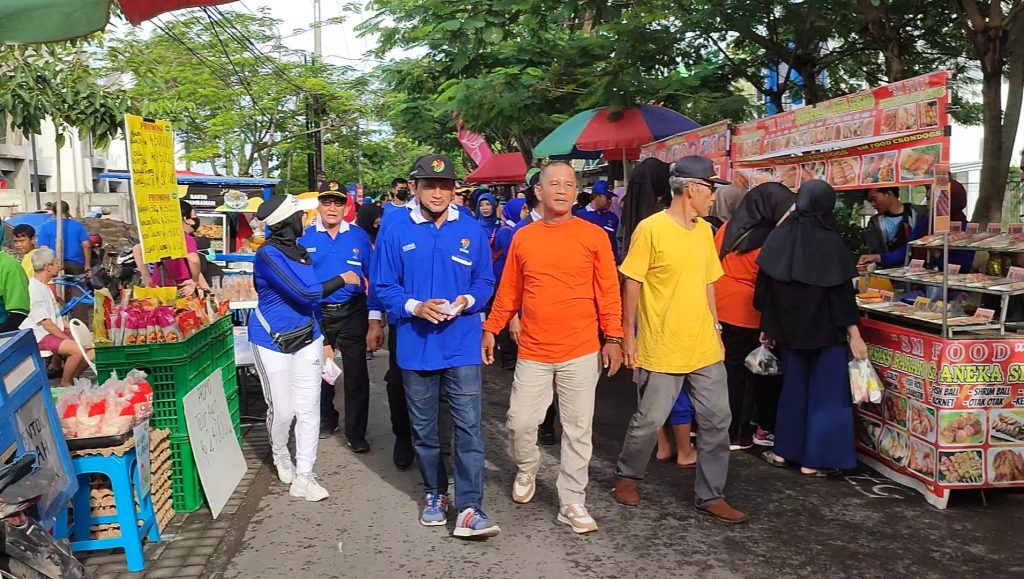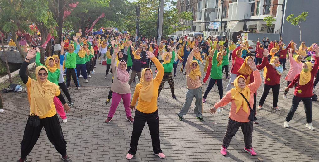 Warga di Kampung Olahraga Masyarakat (KOM) KORMI Kab. Sidoarjo Desa Siwalanpanji memenuhi Bundaran Natura Residences Jalan Siwalanpanji, Desa Siwalanpanji, Kec. Buduran, Sidoarjo, Minggu (26/2/20233). Lebih dari 200 orang hadir untuk berolahraga bersama.